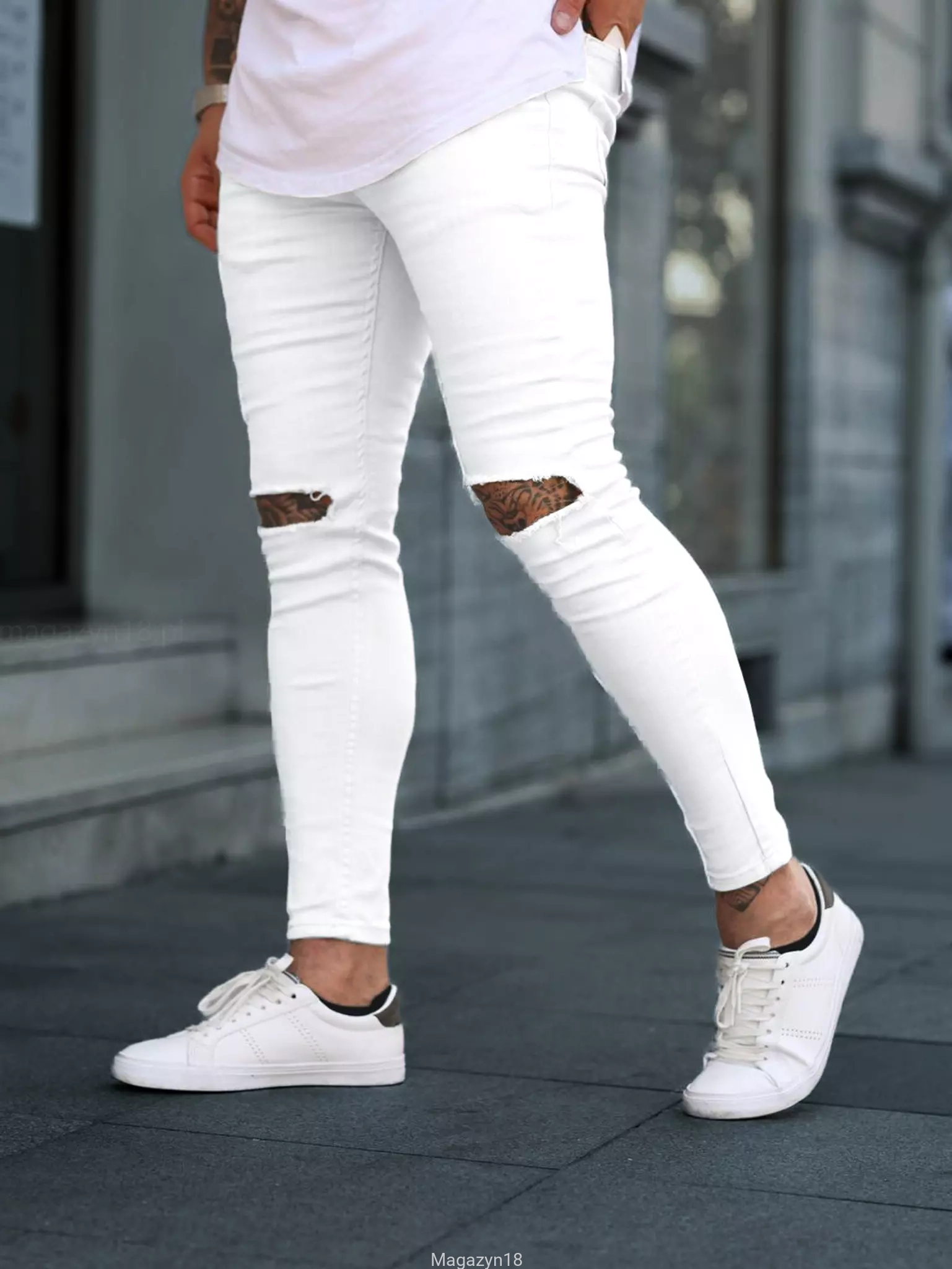 Męskie elastyczne jeansy 6309-01 białe spodnie z dziurą Slimfit