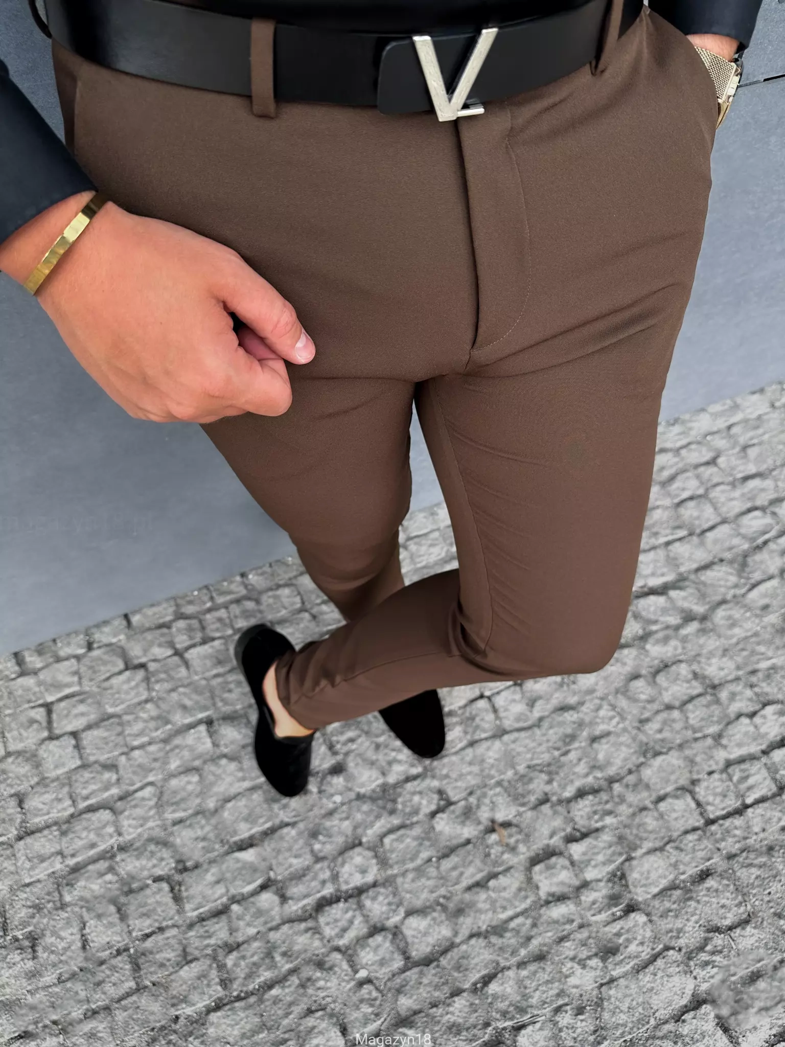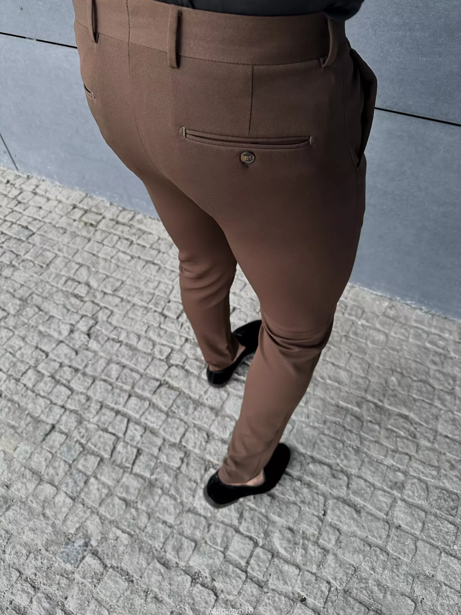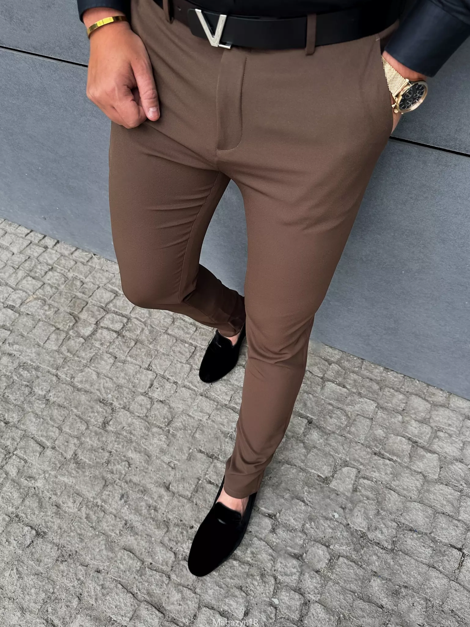 Spodnie eleganckie brązowe męskie chinosy E03-1 dopasowane Slim